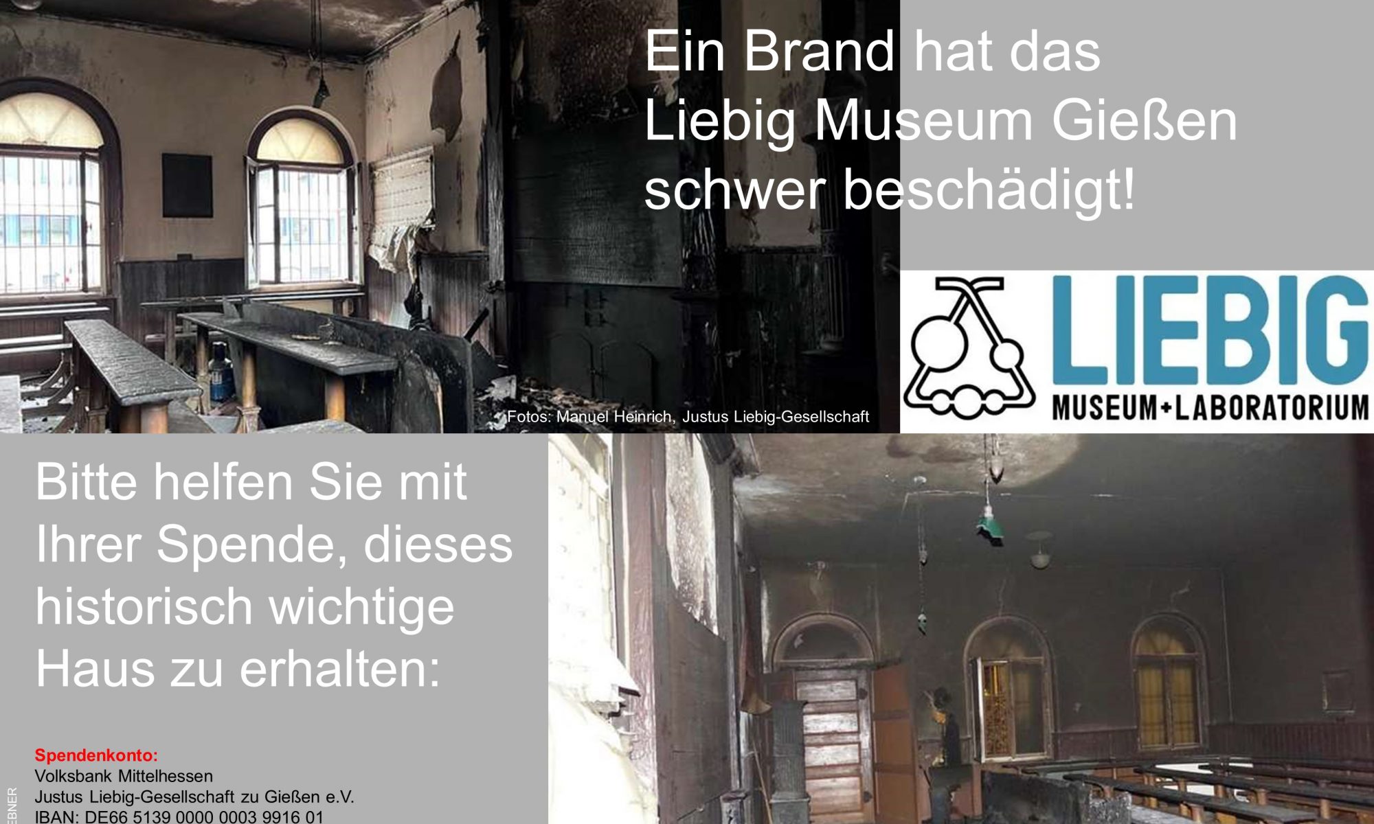 In der Nacht des 5. Dezember wurde der Historische Hörsaal des Laboratoriums von Justus Liebig im Liebig-Museum Gießen durch einen Brand erheblich beschädigt! Dieses Haus ist ein wichtiger Ort der Zeitgeschichte! Hier fanden nicht nur ab 1825 die Vorlesungen (12 Studenten) des damals erst 21 jährigen Justus Liebig statt, sondern er wohnte auch im 1. OG mit seiner Familie (5 Kinder).